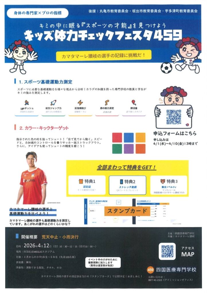 また冠試合に先立ち、小学生を対象とした運動機能の測定会『キッズ体力チェックフェスタ459』を本校主催で開催いたします。10:15から12:15まで、同じく四国化成MEGLIOスタジアムにて、ダッシュ力、ジャンプ力、反復横跳び、脚筋力、肺活量などの測定を予定しており、参加者特典もあります。測定結果のフィードバックを通じた運動の促進や、けが予防への意識の向上も期待しています。※荒天中止・小雨決行