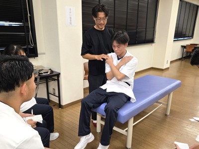 卒業生が施術体験の講師として久しぶりの来校し、後輩である在校生にいろいろと話をしてくれる場面がありました。