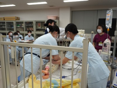 演習では、子どもの状態、状況を共有し、新人看護師役、同チームの看護師役、医師役になり、実践に挑みます。