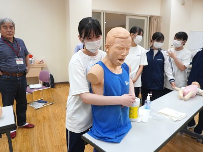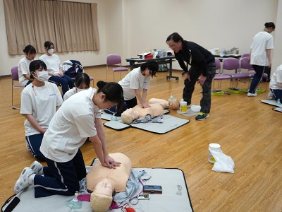 学生は4名ごとのグループに分かれ、担当のインストラクターの指導を受けながら熱心に実技練習を行い、意識の確認、呼吸の確認、脈拍の確認、応援の要請など緊迫した雰囲気の中で実践していました。