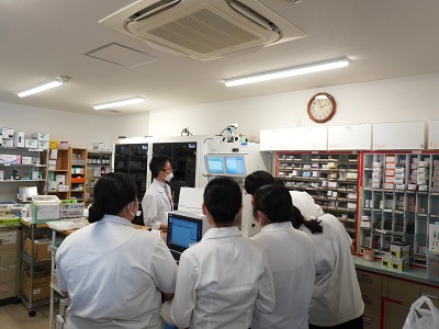 学生たちは、薬剤師の先生方のご指導のもと、処方箋の確認から調剤、薬剤管理、服薬指導、在宅支援まで、調剤薬局で行われている多様な業務を見学・体験しました。