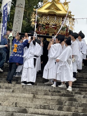 神輿担ぎ手を担当した学生は、本殿前にある神輿を担ぎ、石段を下り宇多津町の街並みへ。