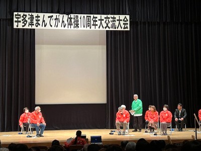 大交流大会には、地域住民200人余りが参加され、10年継続団体表彰、90歳以上の参加者表彰等が行われ、小笠原望医師(四万十市 大野内科)の講演後に、「新・宇多津まんでがん体操」が披露されました。