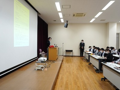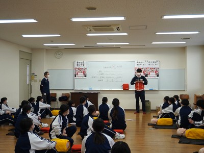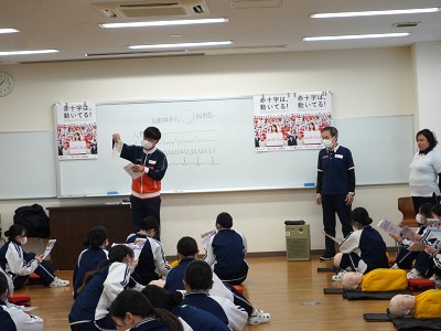 学生は、AEDの構造や使用方法及び注意点等の説明を真剣に聴いていました。