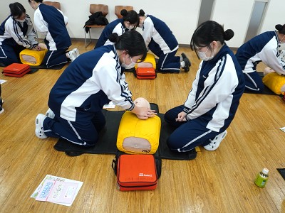 モデル人形を使って2人1組になり、実際に心臓マッサージ。その後AEDの使い方を演習するなど看護師となる学生にとって大変有意義な時間となりました。