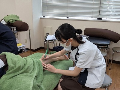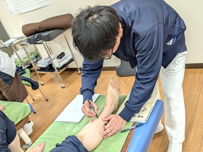 今回は第6回目の授業で、足の胃経・胆経・膀胱経を中心に学習を進めました。学生たちは経絡の流れを確認しながら、身体にラインを描き、主要な経穴の位置を一つひとつ丁寧に取っていきました。